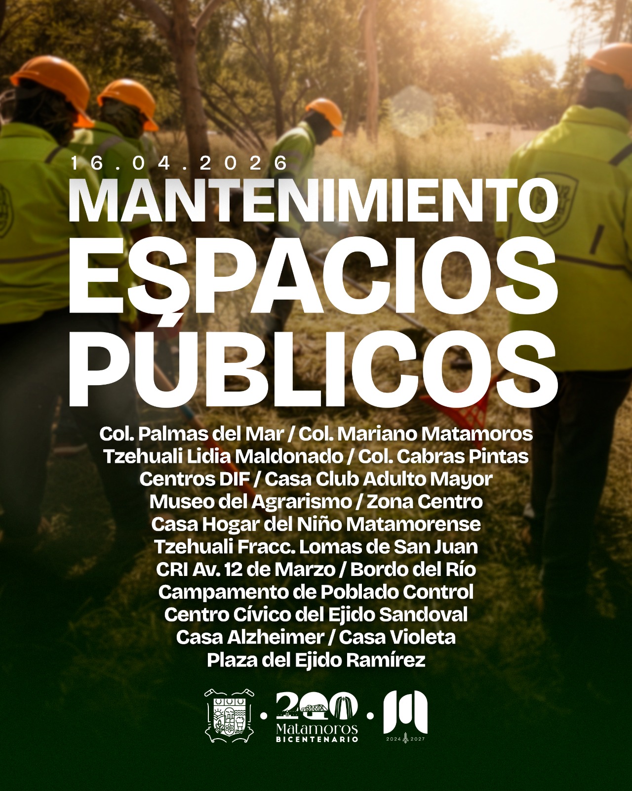 AVISO MATAMOROS Las cuadrillas de Alumbrado Público, bacheo y mantenimiento de espacios públicos ya están trabajando en tu sector.