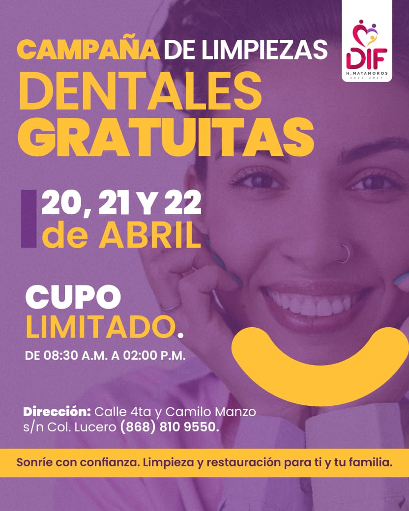 Con el objetivo de promover la salud bucal entre la población, el Sistema DIF Matamoros, encabezado por la presidenta Lic. Ana Ariceaga de Granados, llevará a cabo una campaña gratuita de limpiezas.
