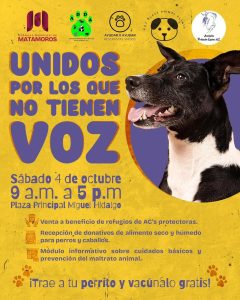 Matamoros, Tam.- El Gobierno de Beto Granados invitó a la comunidad a participar este sábado 4 de octubre en una jornada dedicada al cuidado y protección de los animales, bajo la premisa de que la empatía también se demuestra con acciones.