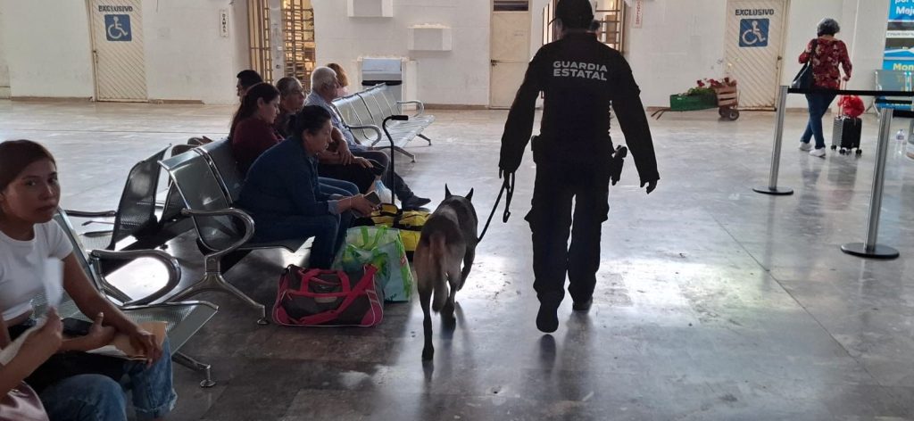Ciudad Victoria, Tamaulipas.– Con el objetivo de reforzar la proximidad social y brindar mayor seguridad a las personas usuarias del transporte público, personal de la Guardia Estatal, a través del Agrupamiento Canino, realiza operativos de vigilancia en la Central de Autobuses de Ciudad Victoria.