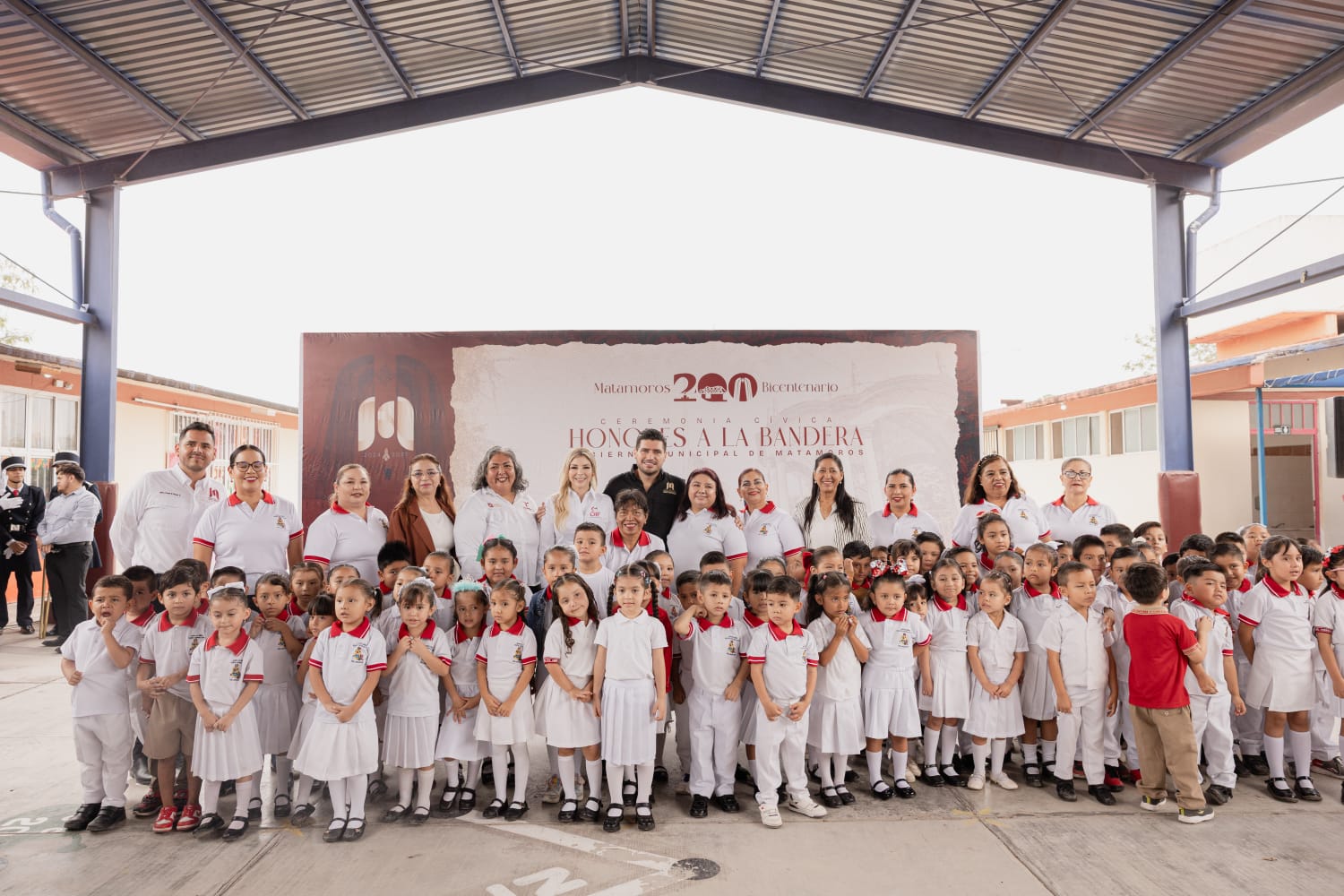 H. Matamoros, Tamaulipas.- Comprometido con la educación y el fortalecimiento de la identidad nacional, el alcalde Beto Granados encabezó la ceremonia de honores a la bandera en el Jardín de Niños «Valentín Contreras», donde reafirmó su apoyo para mejorar las condiciones de aprendizaje de la niñez matamorense.