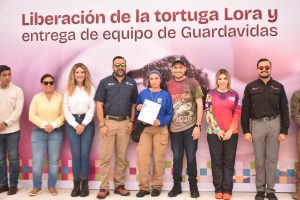 Entre el equipo entregado al personal están desde boyas de rescate, megáfonos, carrete de vida o carrete de rescate, silbatos, gorras y playeras distintivas del cuerpo de rescate, entre otros más.