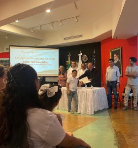 Uno de los momentos más emotivos de la ceremonia fue la participación de la niña Danna Cristel Salinas Sosa, quien agradeció, de manera bilingüe, al gobernador por el respaldo brindado a sus padres durante el proceso para obtener su doble nacionalidad.